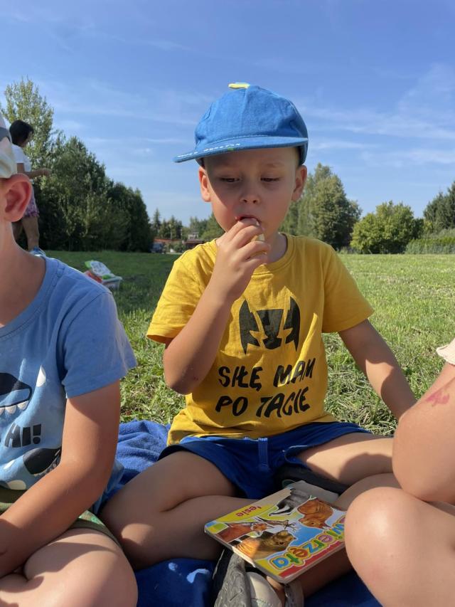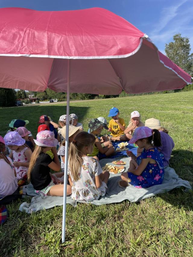Ciocie z grupy biedronki zorganizowały piknik z okazji pożegnania wakacji. Przedszkolaki z radością zjadały przekąski, owoce i odpoczywały wśród natury.
