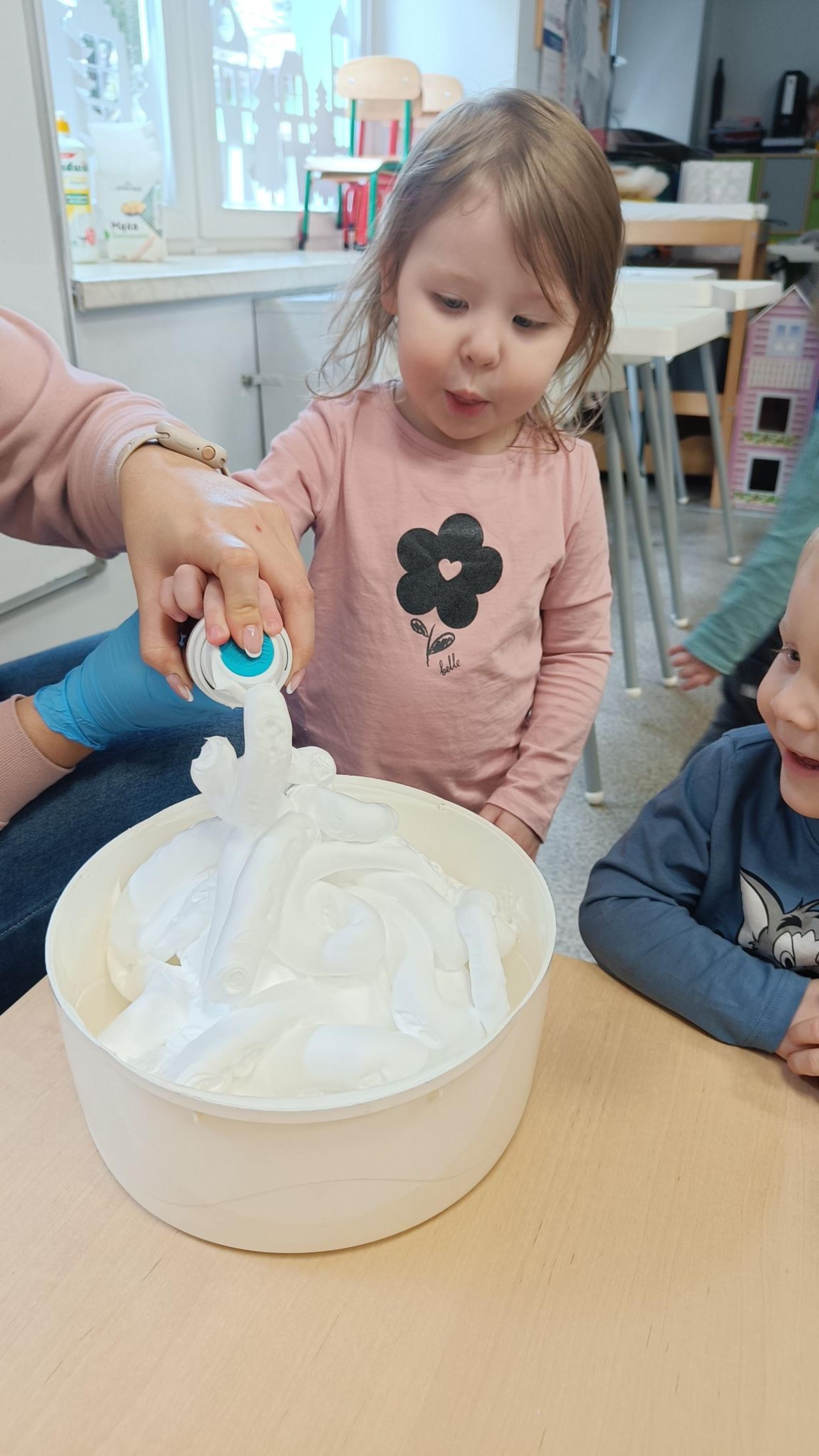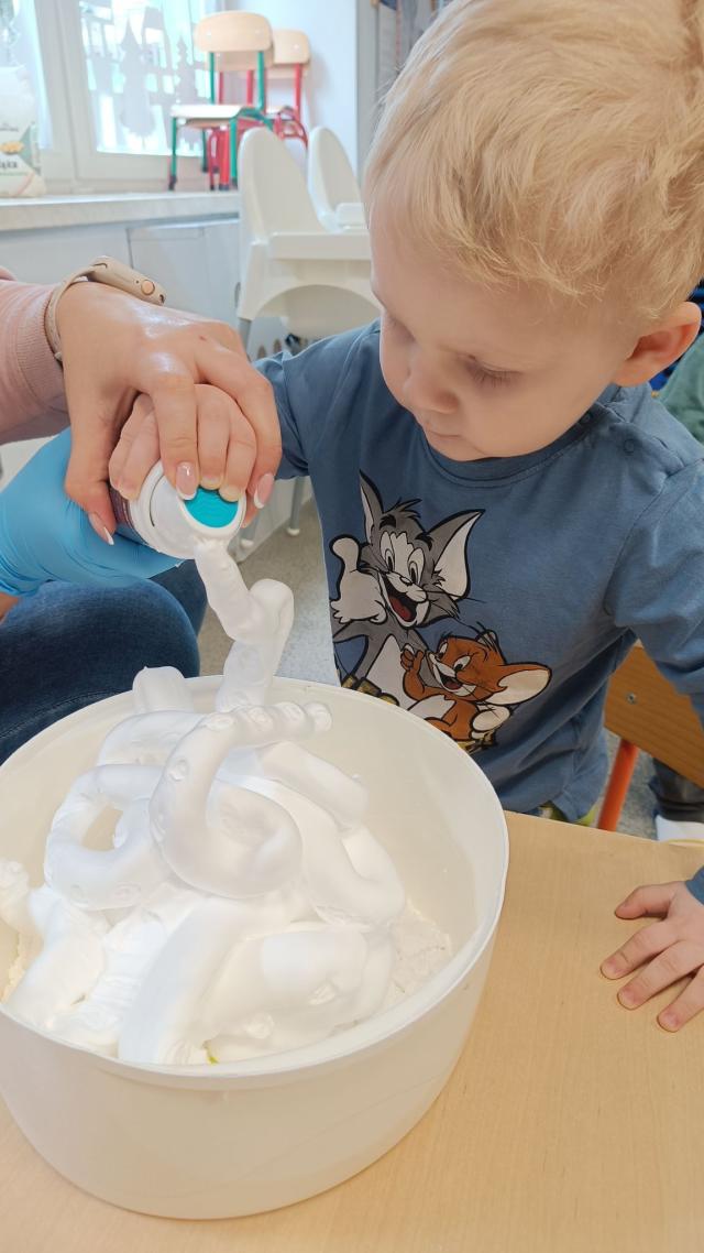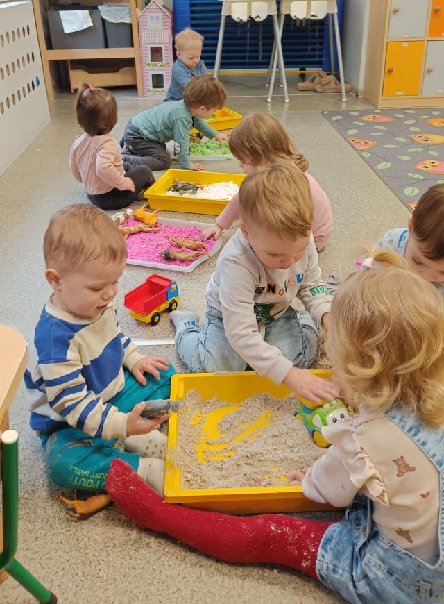 Zabawy piaskiem kinetycznym i masą piankową. Żłobkowe sówki uczą się kreatywności, współpracy a przy tym świetnie się bawią.