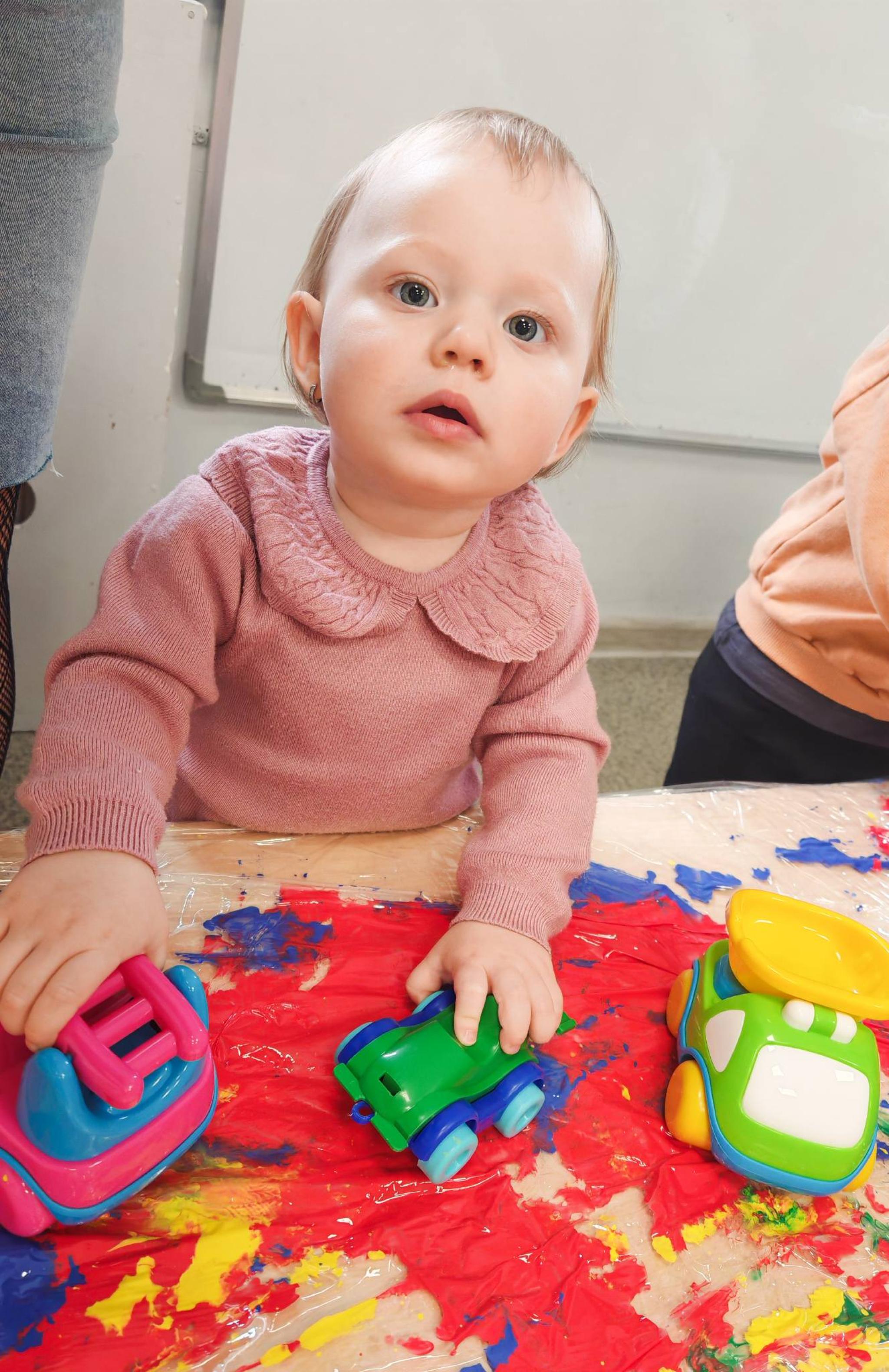 Dziś żłobkowe sówki rozwijały motorykę małą oraz koordynację ręka-oko. Zabawa ta pozwala zrozumieć zależności przyczynowo-skutkowe( jak nacisnę to zostanie ślad), wspomaga koncentrację oraz stymuluje dotyk( różne faktury: folia, farba).