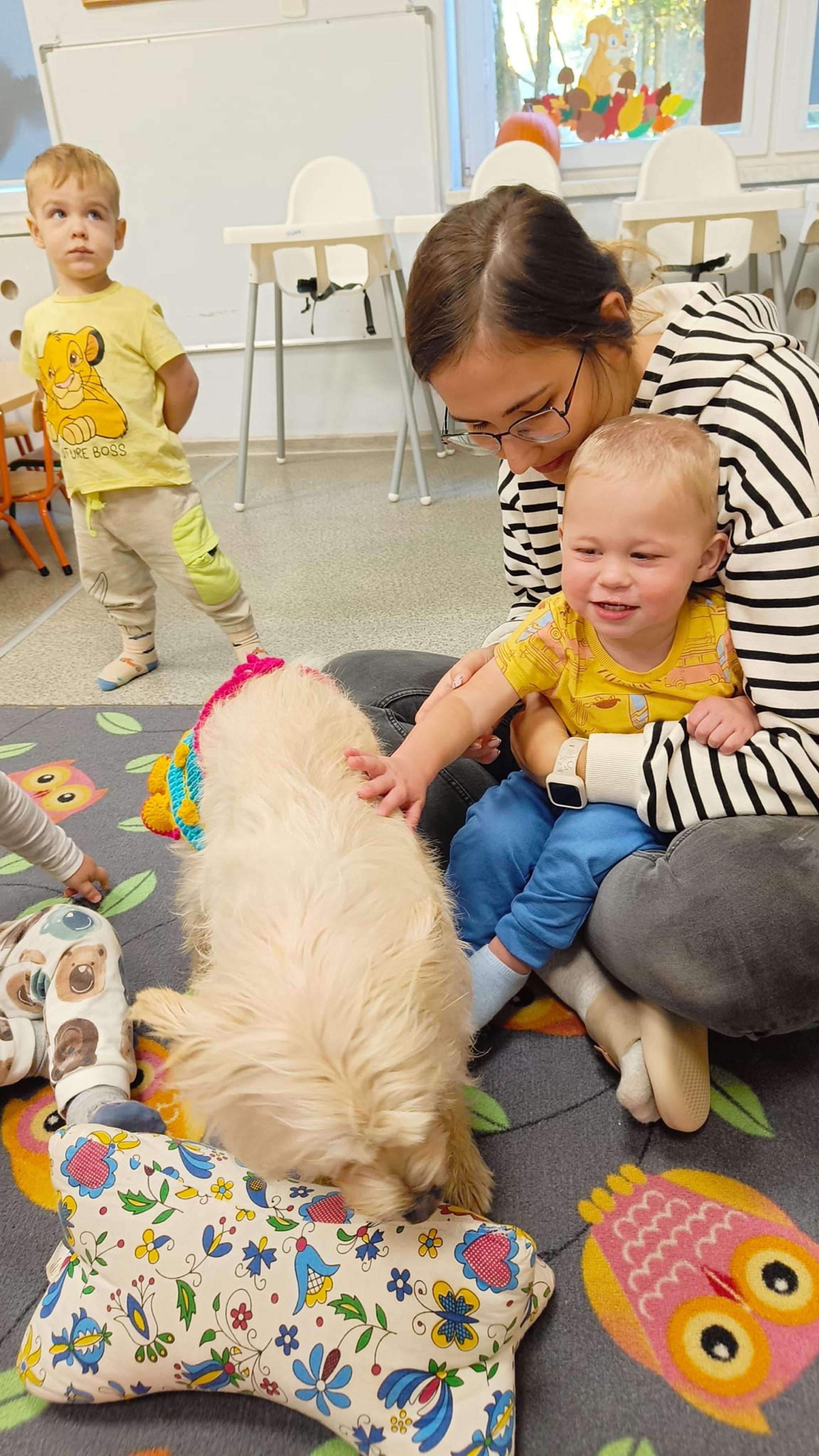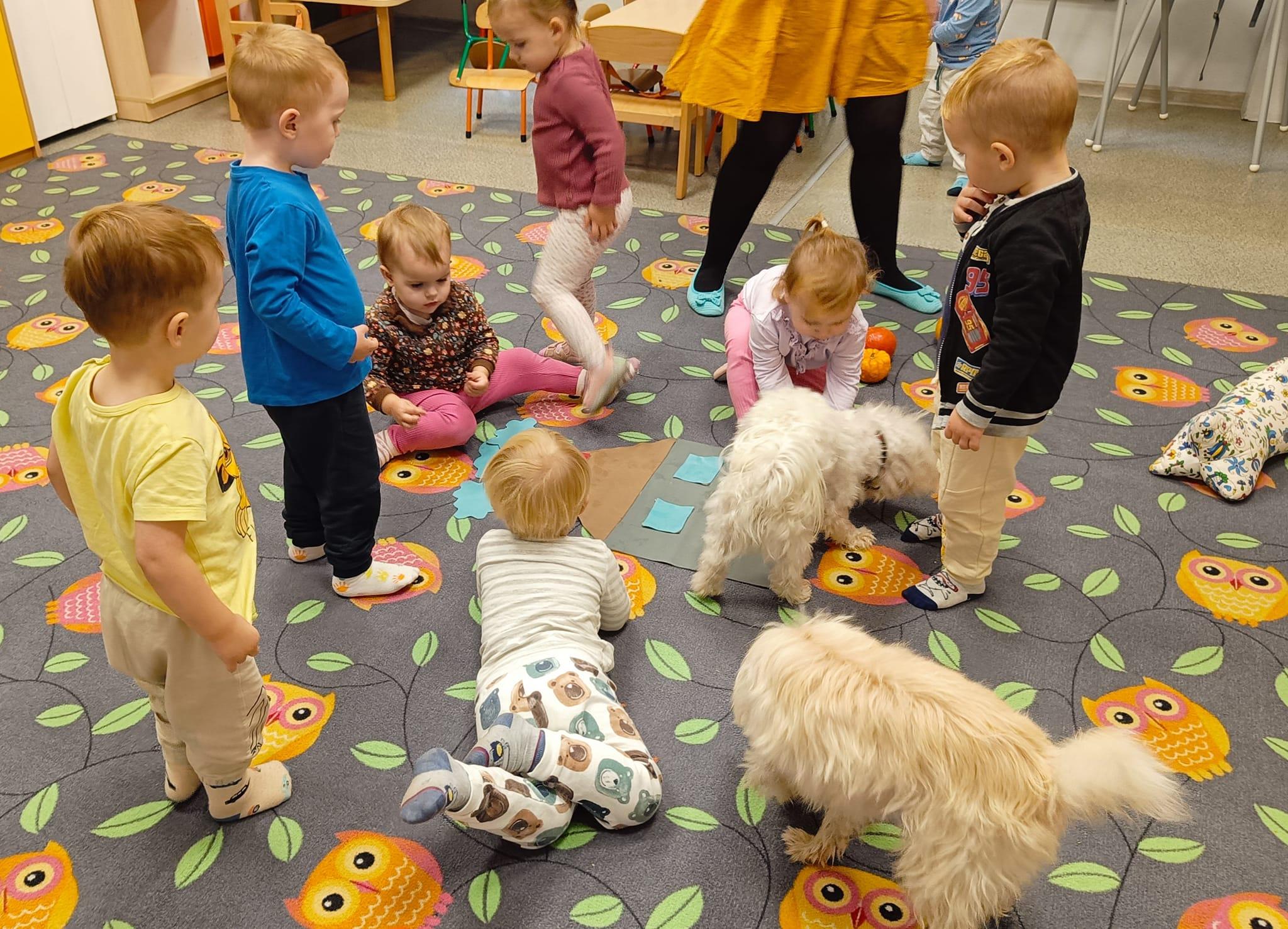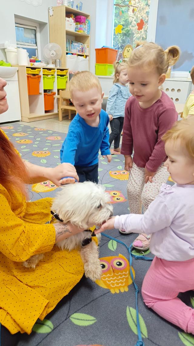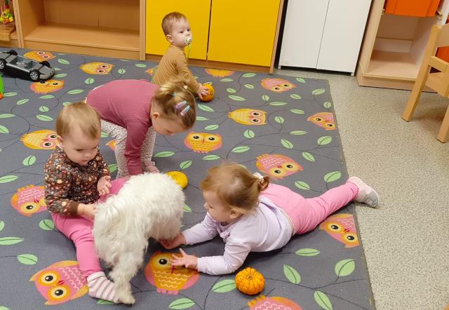Dziś odwiedziły nas pieski na Dogoterapia i relaks dla pieska. Dzieci zrobiły tor dyniowy, karmiły oraz czesały pieski. Najwięcej radości sprawiło przytulanie i głaskanie piesków.