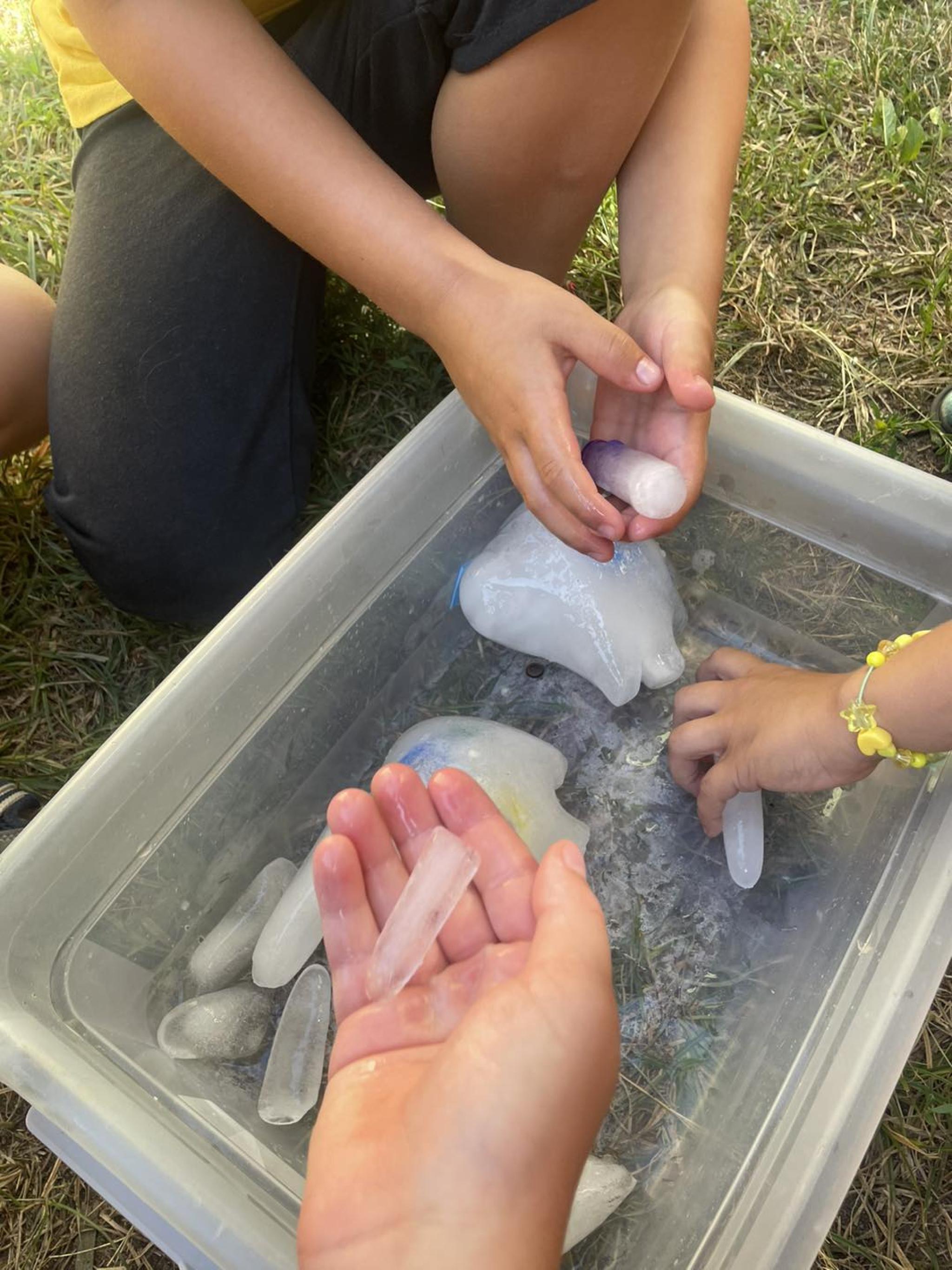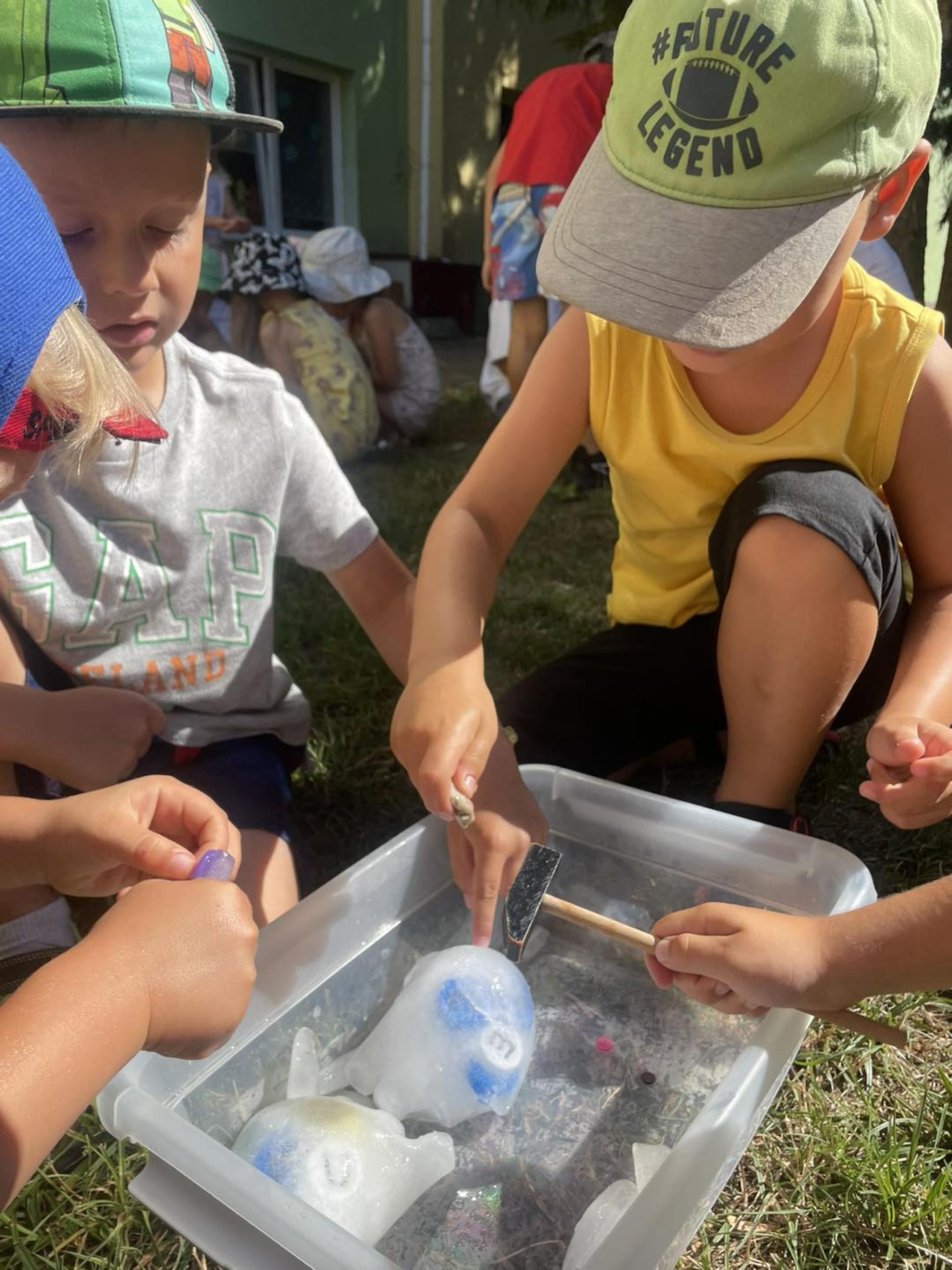 Dzieci z grupy biedronki próbowały wydobyć z lodu ukryte skarby. Lodowa zabawa wspaniale umiliła czas na słońcu.