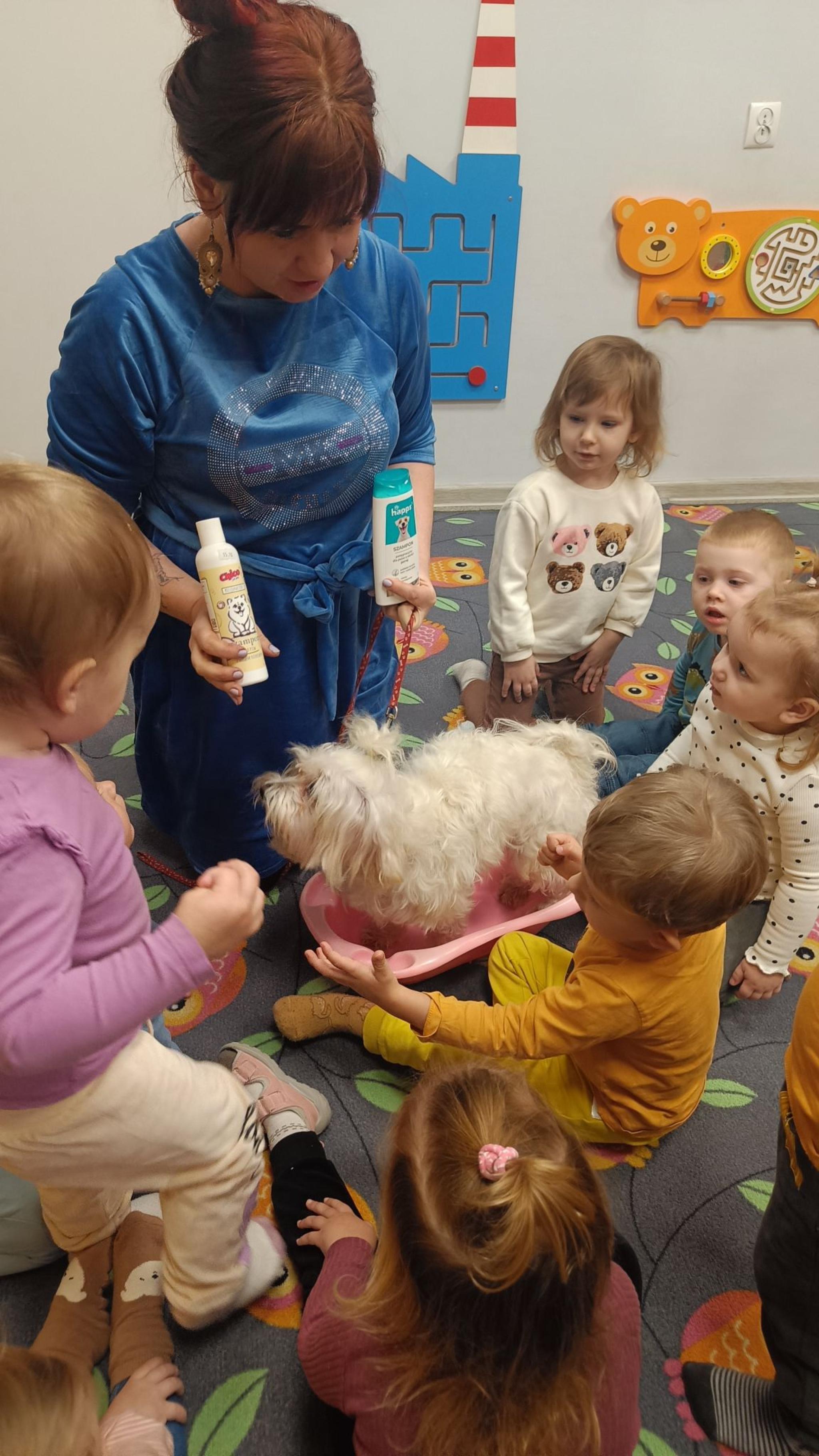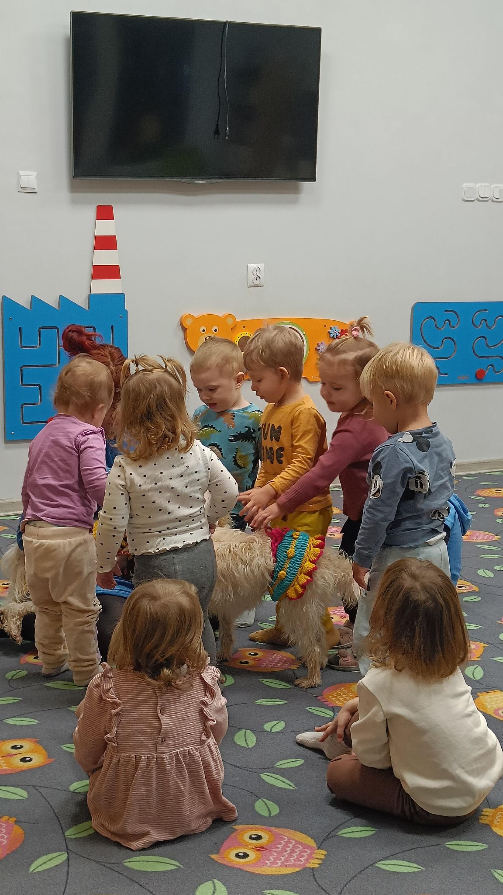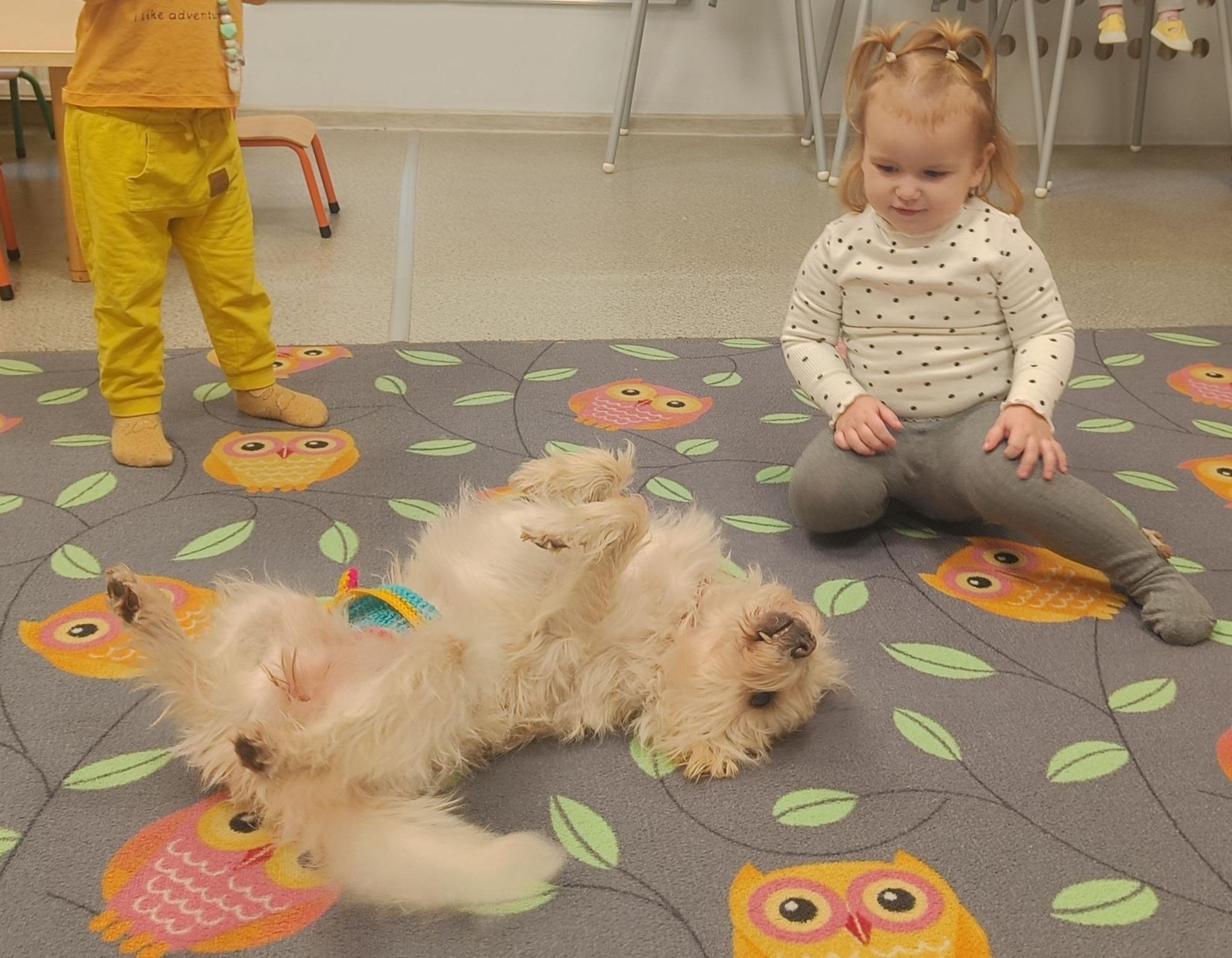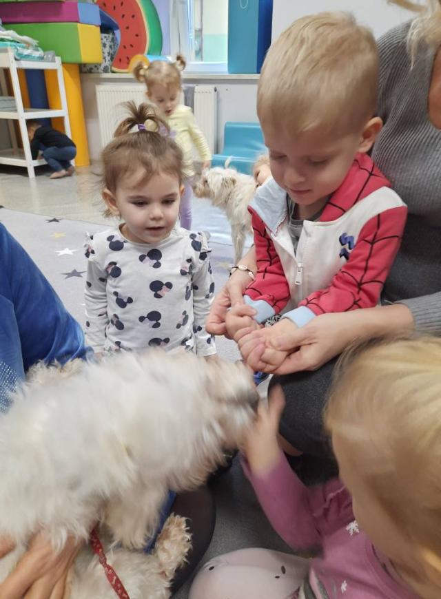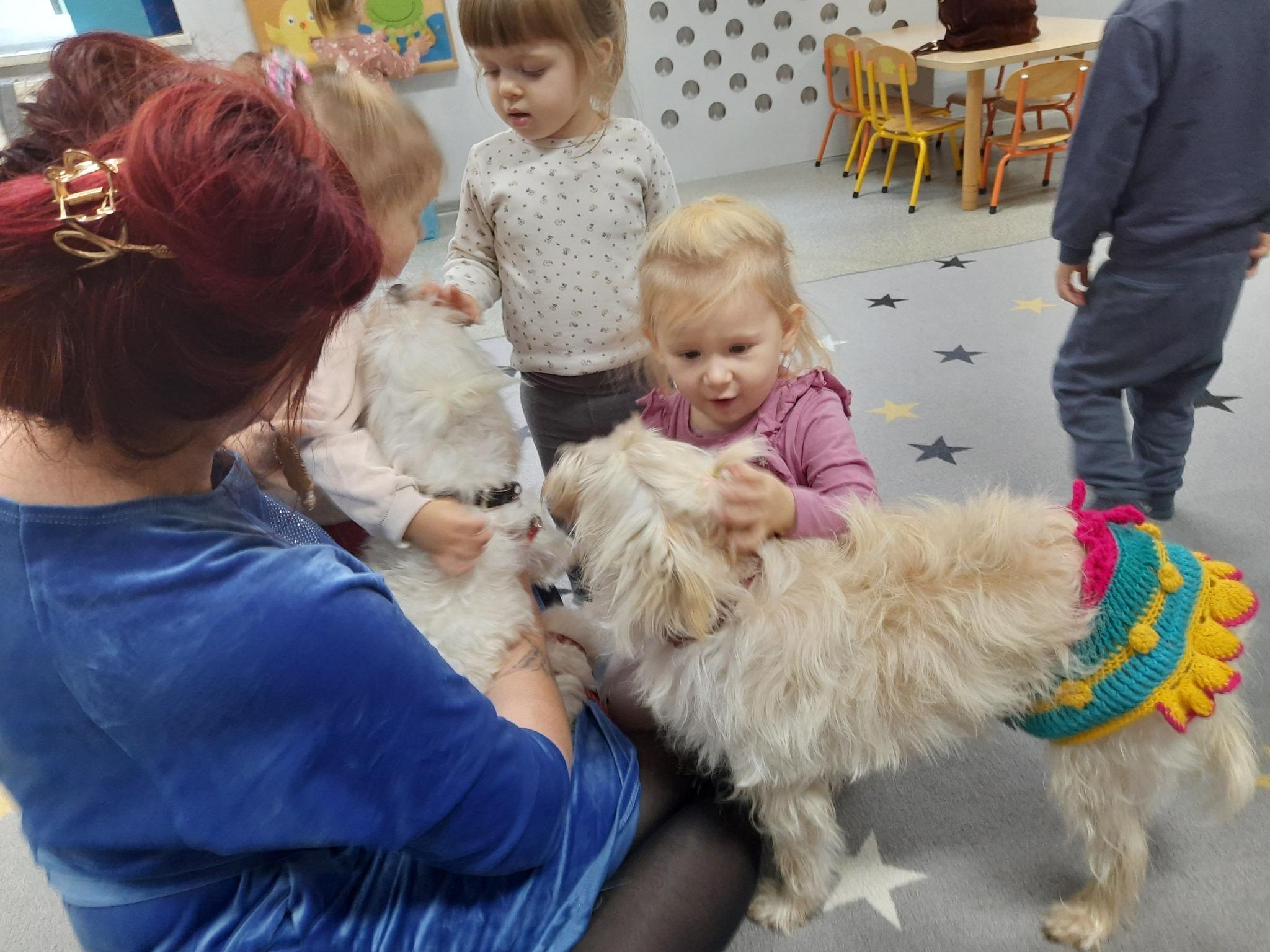 Dziś ponownie odwiedziły nas pieski, na które dzieci z niecierpliwością czekały. Były psie buziaki, przytulanki, ćwiczenia z jogi, spacer z pieskiem na smyczy i wiele innych ciekawych zabaw.