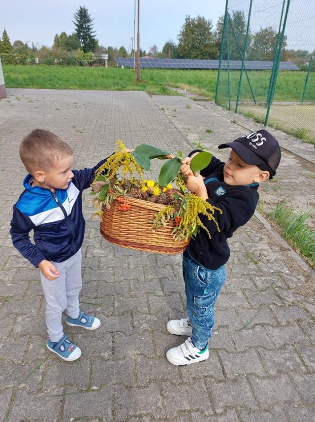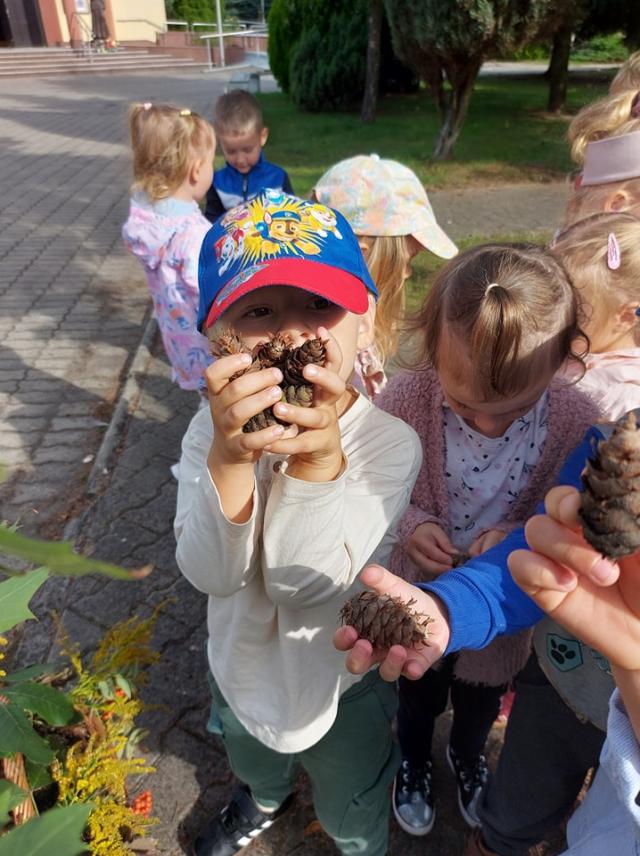 ,,Idzie lasem Pani Jesień, jarzębinę w koszu niesie.... " Grupa Motylki korzystając z pięknej pogody wyruszyła na spacer w poszukiwaniu skarbów jesieni.