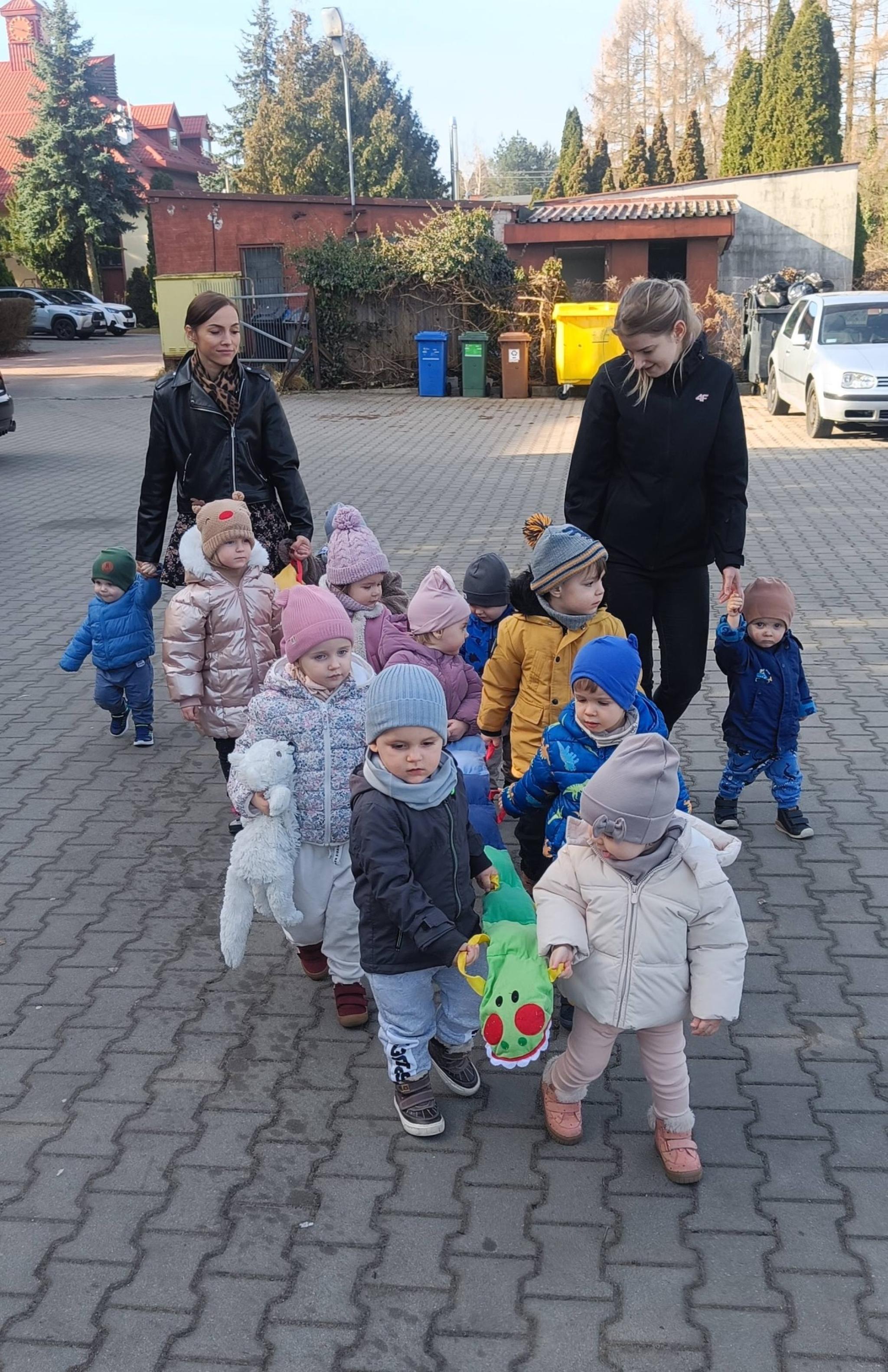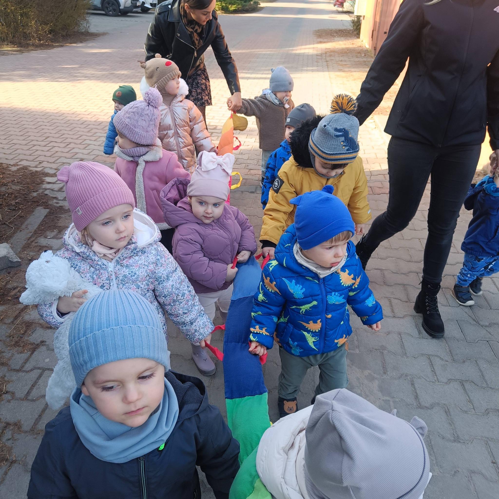 Maluchy podziwiały otaczającą nas przyrodę, powoli budzącą się do życia. Odwiedziły również pieska i kotka . Są to zwierzątka mieszkające na terenie naszego żłobka. W spacerze pomógł nam kolorowy przyjaciel wąż, który utrzymywał dzieci w parach. Było bardzo przyjemnie a dzieci ochoczo i z uśmiechem dreptały nóżkami .