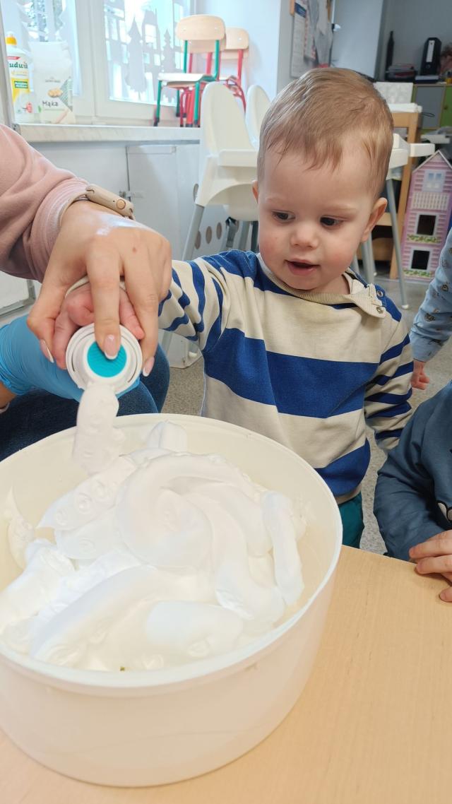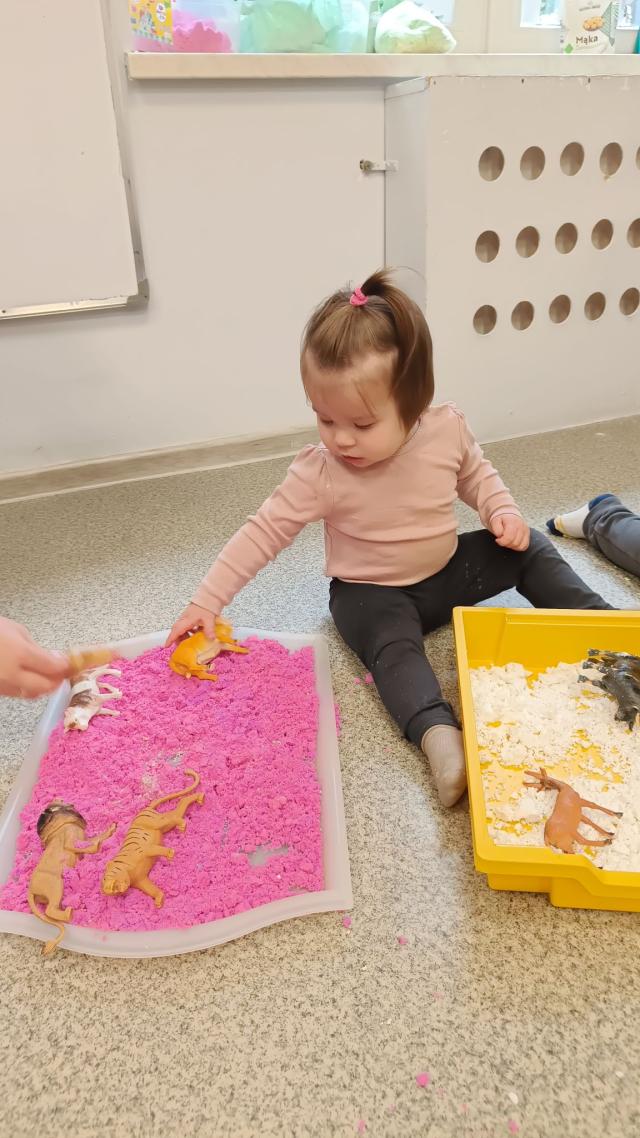 Zabawy piaskiem kinetycznym i masą piankową. Żłobkowe sówki uczą się kreatywności, współpracy a przy tym świetnie się bawią.